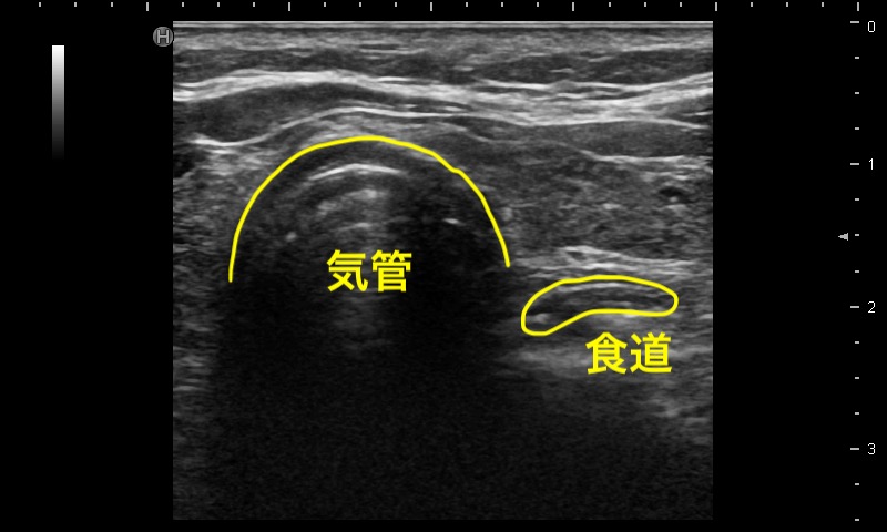 バイタルサインのある患者での気管挿管の確認で最も信頼性が高いのはEtCO2の検知であるが、気道エコーにも同等の検出精度がある。通常、気管挿管の前後では描出像に変化がない(Single tract sign、下図左)が、食道挿管では挿管後に輪状構造物が食道内(多くは気管の左側、画面上は右側)に出現する。この所見はDouble tract sign(下図右)とよばれ、食道挿管を強く示唆する。バイタルサインのない患者では、気管挿管後もEtCO2が低値を示すことがあるが、気道エコーでは非CPA患者と同様な所見が得られる。(関連動画:#55, #69)