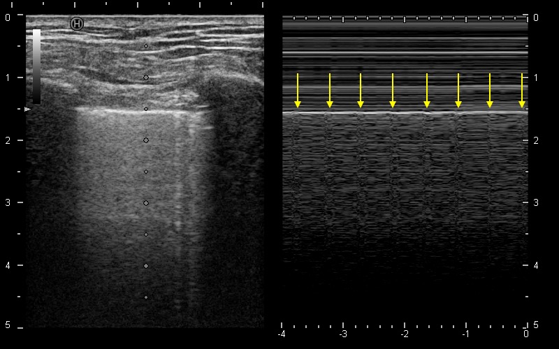 肺エコーにおいて、Lung slidingの消失は気胸の除外に有用な感度の高い所見であるが、一方で特異度はやや低い。胸膜癒着や換気量低下、無呼吸状態ではLung slidingは目立たないこともあるが、心拍動が肺を伝って壁側胸膜を律動的に揺らす結果、Mモードで等間隔の縦縞模様を形成する。この所見がLung pulse signであり、心臓とプローブ下の壁側胸膜の間に空気の層が存在しない、すなわち気胸がないことを示す所見である。(関連動画:#95)