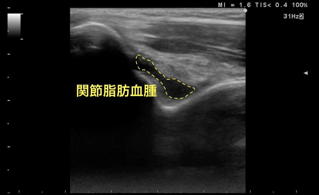 肘関節内の骨折は、レントゲンではFat pad signとして検出される。超音波でも、肘関節を90度屈曲させ、上腕骨背側からリニアプローブを当てて肘頭窩の後方脂肪体(Fat pad)を観察することができる。同部位の血腫はレントゲンにおける後方Fad pad signと同等の意味を持つ。上の画像では肘頭窩内部に低エコー領域がみられ、関節内血腫(Lipohemarthrosis:関節脂肪血腫)が示唆される。これは関節内骨折に随伴する所見を意味し、特に小児では緊急性の高い上腕骨顆上骨折を疑う上でも重要な所見である。