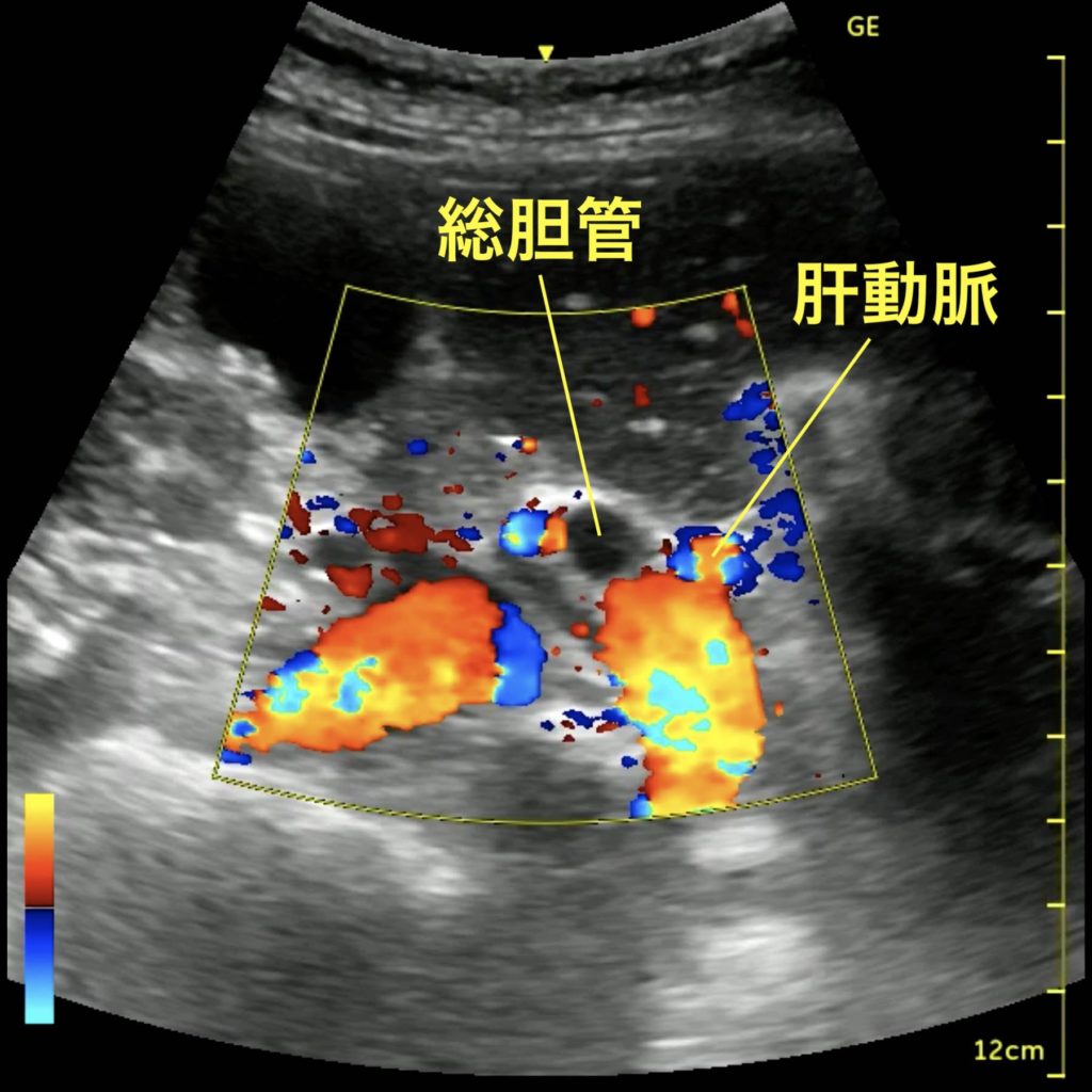 総胆管の同定は、胆嚢と右門脈との位置関係によって行うのが比較的容易である。門脈の浅側には肝動脈と総胆管が3つ組になって存在しており、血流のない方が総胆管である。通常は冠動脈も総胆管も同程度の径であるが、この画像のように一方が拡張している場合は総胆管の閉塞が示唆される。症候群からは閉塞性化膿性胆管炎が疑われる。